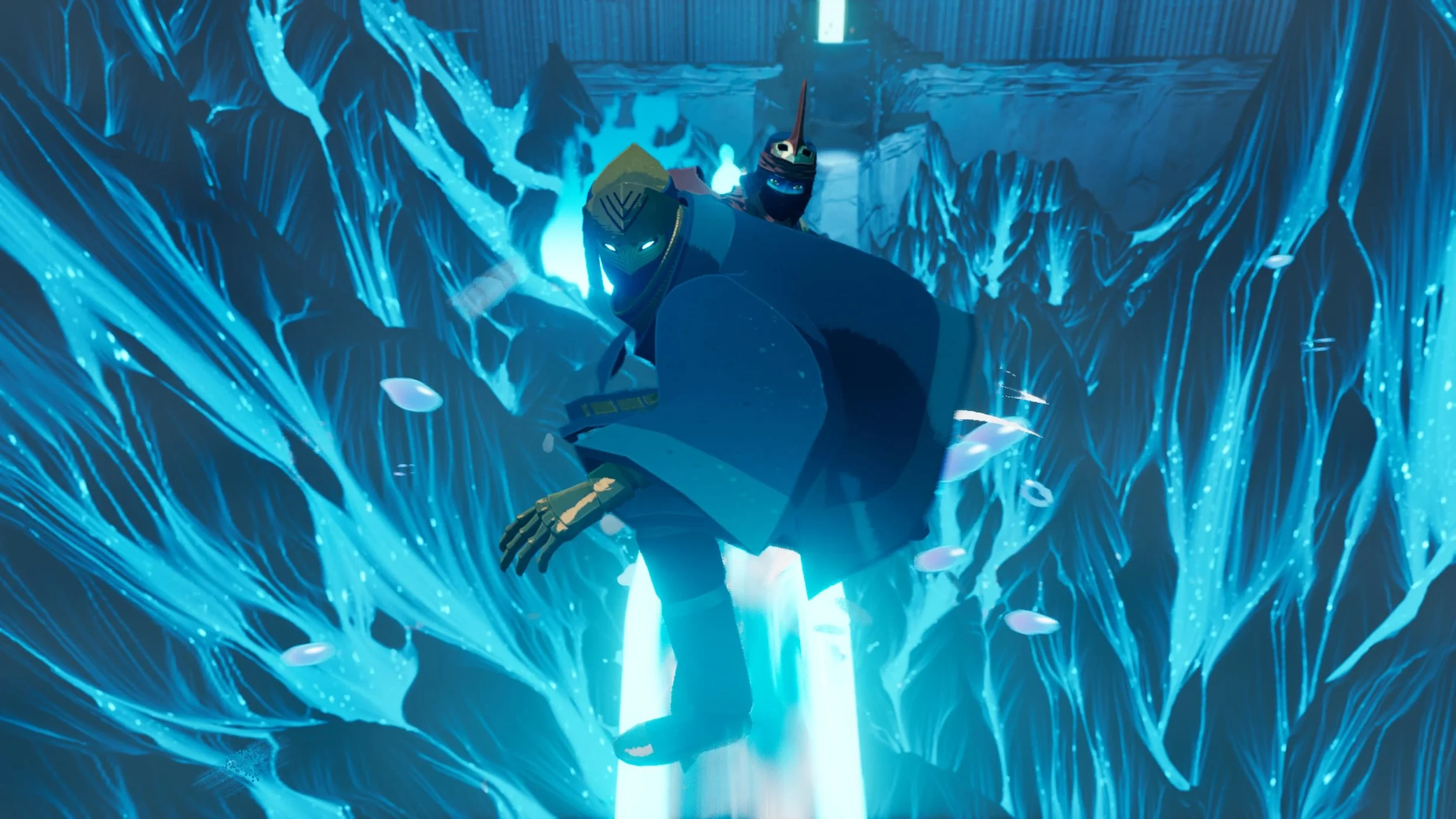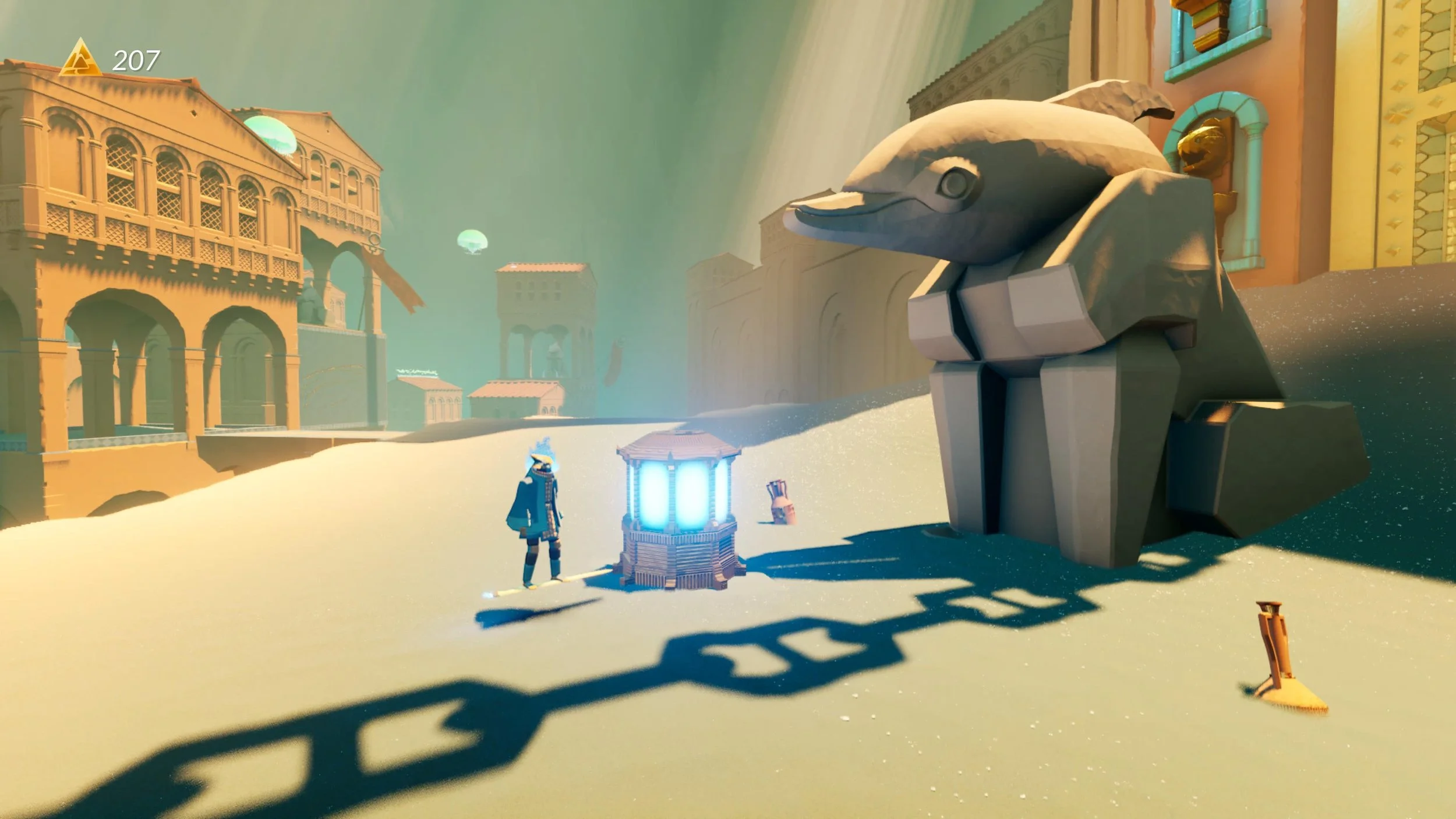 The main mechanic of the game is to surf around the environments on your sword, discovering the aforementioned water based elements that regenerate an area back to life. Once it’s regenerated you uncover the pathway forward to the next area you need to unlock to progress the game. You also uncover other mysteries or puzzles that challenge you to use your skateboard-like abilities to find secrets, gain access to hidden areas or collect golden Tetra as your reward. The golden Tetra you collect are donated to a mysterious character who pops up throughout the game - think Hestu from Breath of the Wild or Tears of the Kingdom. Donate enough Tetra to this mysterious being and you’ll learn new tricks which aid you in your exploration of the environments.