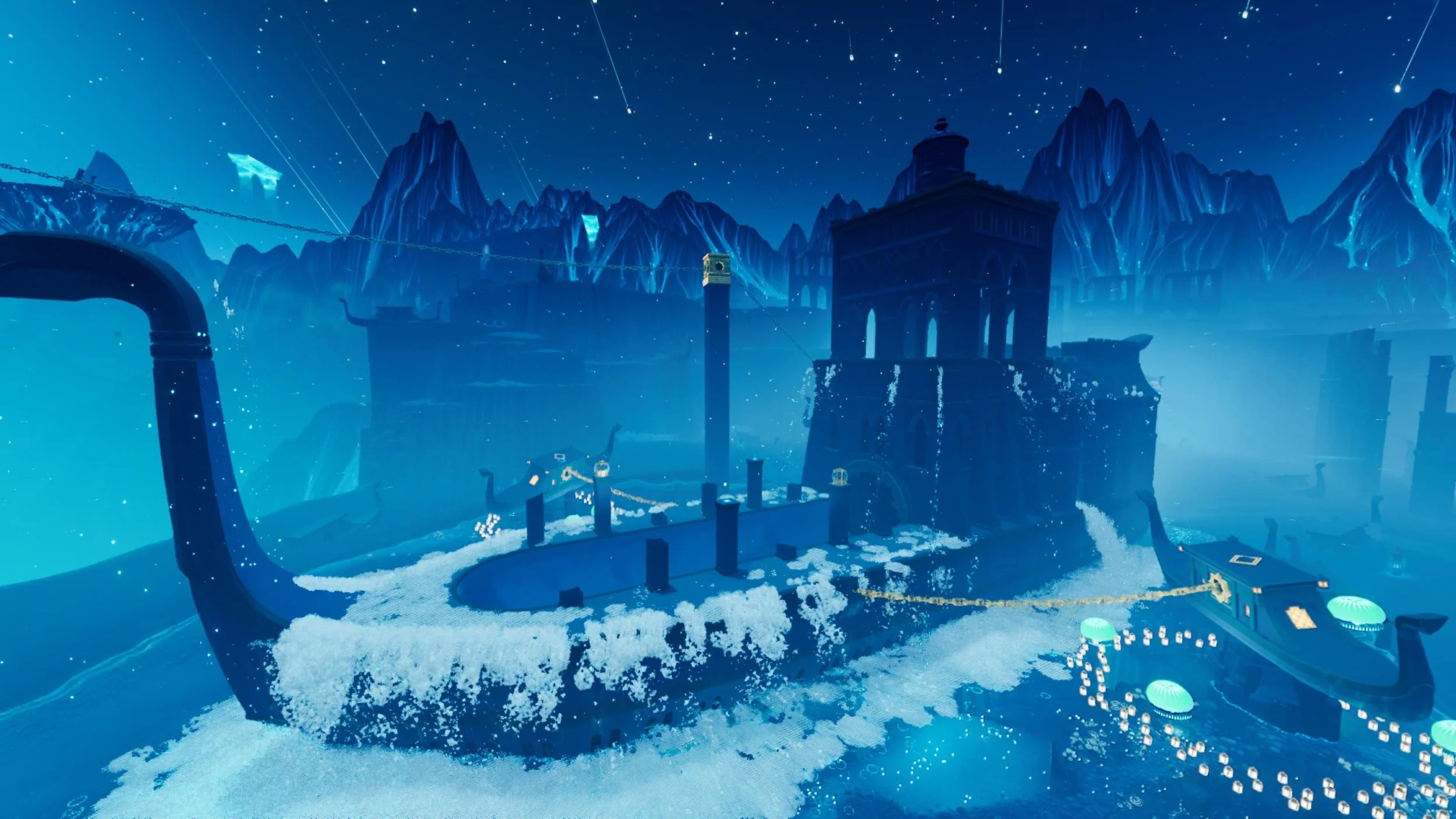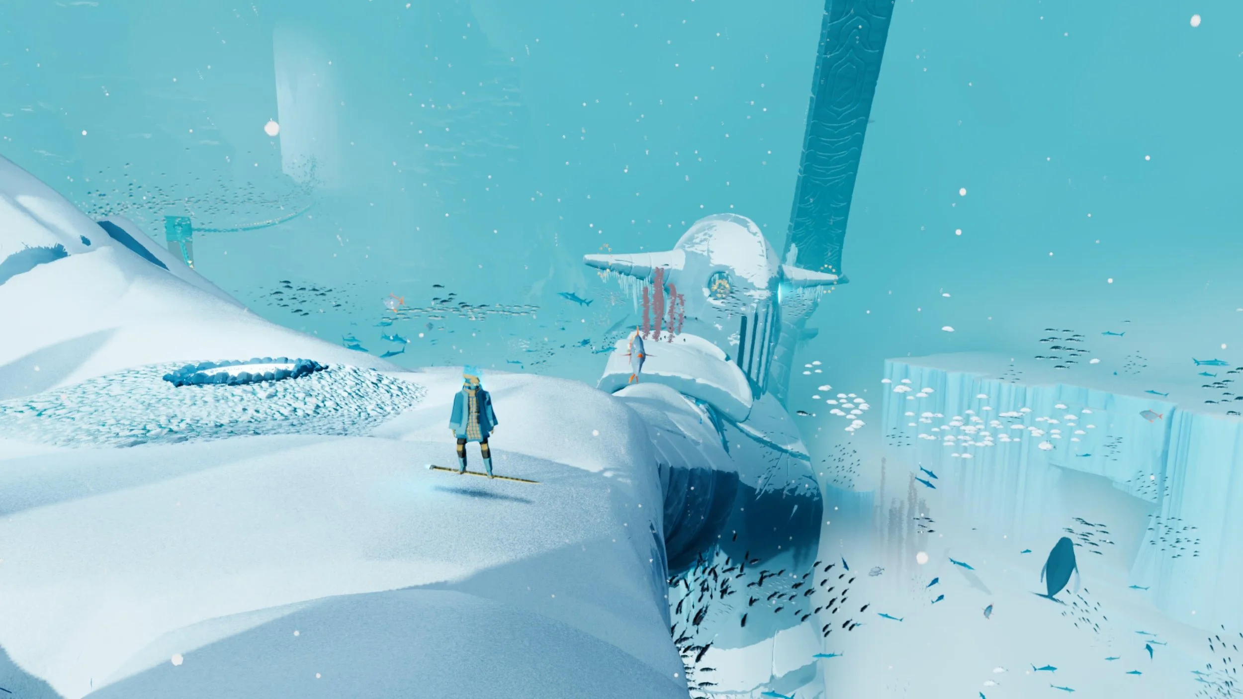 From here you venture out of the cave into a vast open areas that are barren of life with deserted buildings and temples - relics of a forgotten time. As you explore the world you discover water elements, and once activated, they bring the environment back to life, restoring the surrounding areas from drab desserts or barren snow laden areas to ones that are full of lush sea plants and animals. This simple, yet powerful theme of restoration and rebirth is what drives the story forward. We don’t fully understand why the Wraith is tasked with this journey, or what happened to this world, but clues are discovered along the way that point to a epic battle between larger than life beings from a forgotten time.