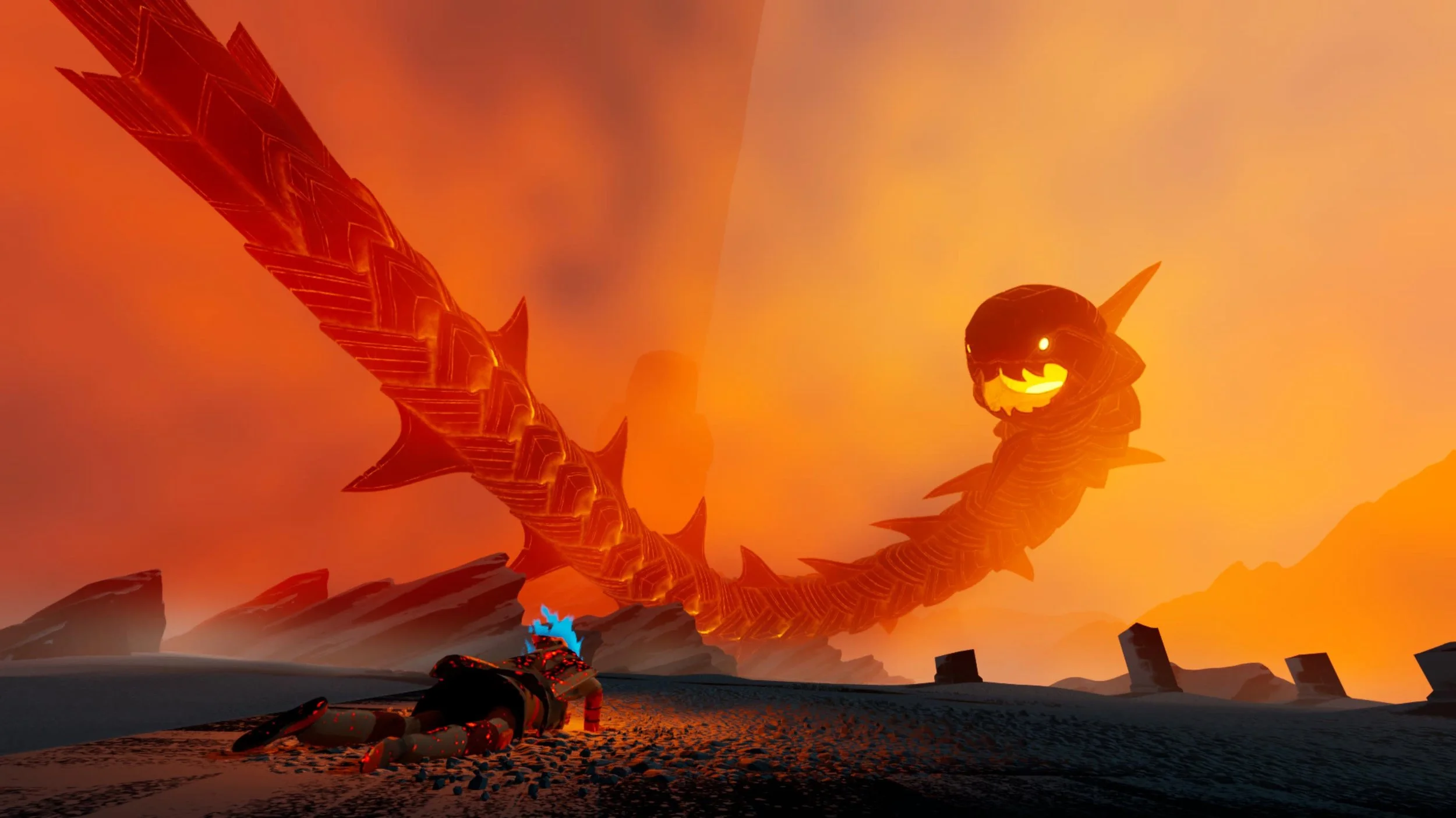 Sword of the Sea is a story of discovery and regeneration. It’s also a story with very little actual story telling. You play as a Wraith, a statue, seemingly frozen in time amongst an army of Wraiths statues in a cave within a desert. You are awaken and animated by a single drop of water that hydrates you and your sword or hoverboard, or skateboard, or skate-sword? Let’s go with skate-sword.